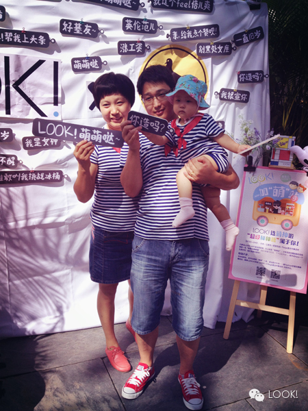 一家三口穿着海魂衫合影,全家人都是蓝白主题,拿着“LOOK!萌萌哒~”的标签,画面实在太美不敢看。