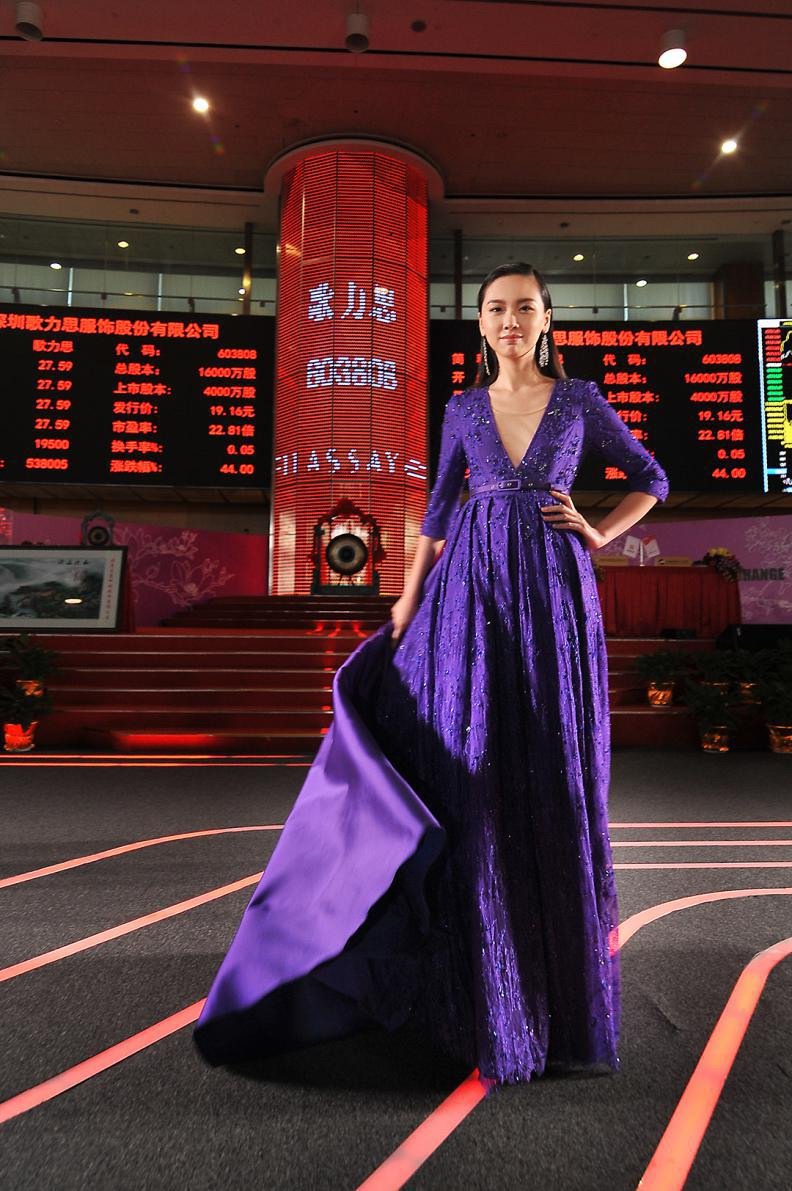 一改往日常规的上市仪式,歌力思以其国际化的创新思维与上交所跨界一场时尚与金融的DNA混合之旅。超模佀淼滨率先出场,领衔15位超模身着歌力思春夏新装穿梭而过,红色系时装象征着中国股市的轰烈牛市,超模王能最后一袭紫色礼服压轴出场,作为一抹亮色毫无违和感地融入庄严的上交所会场。光鲜亮丽的超模、大气优雅的设计, 变幻莫测的数字,歌力思让这场全球首创把上海证券交易所当作创意T台的时装大秀如盖茨比的优雅盛宴,充满创意的华丽举措令人意外不已。