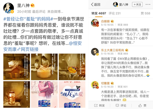 微博#曾经让你羞耻的妈妈#话题讨论,以富有反转性的海报打动人心,实现了情感反转,抓住了大众泪点。以此点出理解母爱,感恩母爱,拥抱母爱的主题,2天内,引发了大量的转发和讨论。