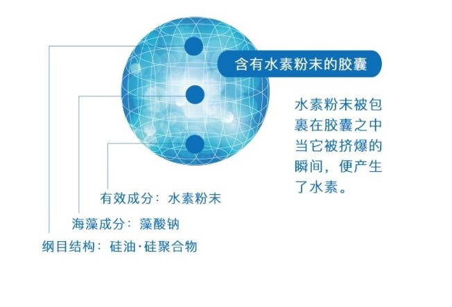 水素(氢元素)是近年来备受医疗界推崇的成分,因其是唯一能将堆积在体内以及皮肤上的恶性氧还原成水的成分。抗过敏抗炎的奇效,水素的美容效果不言而喻。但由于水素成分极易与活性氧发生化学反应,无法存在于自然界,如何保持水素的活性瞬间产生新鲜的水素是美容产品研发的一大难题。