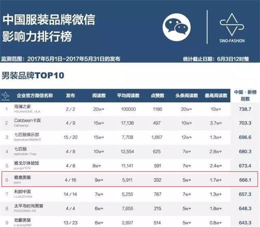 统计周期是5月1日到5月31日,以服装协会注册单位和沪深股市服装家纺板块为研究对象进行排查,首次发布中国服装品牌官方微信影响力排行榜。正式运营仅三年的雅鹿男装微信公众号位列榜单第六。