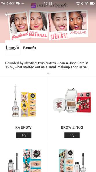 除了巴西,美妆相机的试妆功能也在全球155个国家和地区同步上线,并已经在海外与多个知名品牌展开了合作。在英国,美国知名时尚彩妆品牌Benefit与美妆相机共同推出了名为“Benefit Brows”的4款主题妆容,试妆专区也上线了6款Benefit眉妆单品,试妆满意的用户可以点击一键购买跳转到Benifit官网,挑选心仪的彩妆单品。