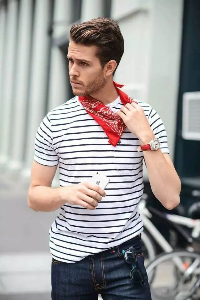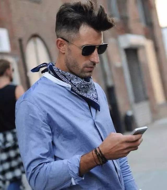 小方巾就是正方形的一块布,个头不大。它最早出现在男人身上,是绅士们塞在正装胸兜里擦汗用的,后来才逐渐演变成一种装饰品。小方巾的图案花样繁多,如果你只有3件T恤,有3条方巾,每条方巾有3种戴法,那么3X3X3=27,3件T恤能穿出27种花样,简直是懒直男福音!