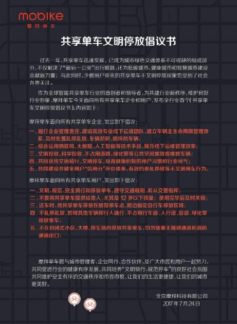 近日,摩拜单车发布《共享单车文明停放倡议书》,呼吁全体共享单车企业加强管理、及时处置乱停乱放、车辆淤积等问题;并呼吁用户文明用车、文明停放,共同维护良好的交通秩序和市容市貌。