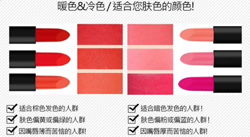口红虽然能够让妹子更女人,但是不同肤色、发色的美女,使用口红还是有讲究的。比如棕色发色、肤色偏黄或偏绿、嘴唇薄的妹子们适合用暖色系的口红;而暗色发色、肤色偏粉或偏蓝、嘴唇厚的妹子们则比较适合用冷色系的口红。