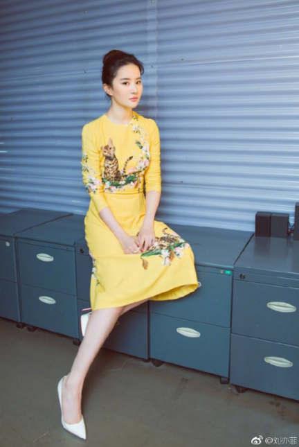 黄色印花礼服衬的她肌肤更加白皙,衣服上的猫咪印花也是很有新意。非常爱猫的刘亦菲估计也非常喜欢这件衣服吧!