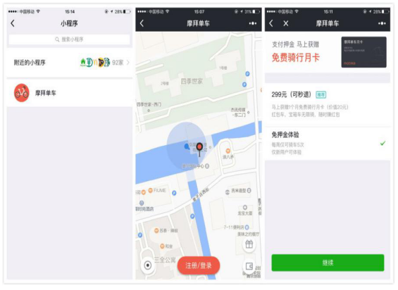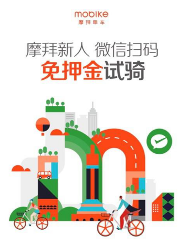 8月7日,共享单车行业第一品牌摩拜单车联合战略合作伙伴微信,在全国超150个城市推出了新用户“免押金试骑”活动。通过微信小程序端注册摩拜单车账号,即可参加“免押金试骑”,每周享受5次免押金骑行。
