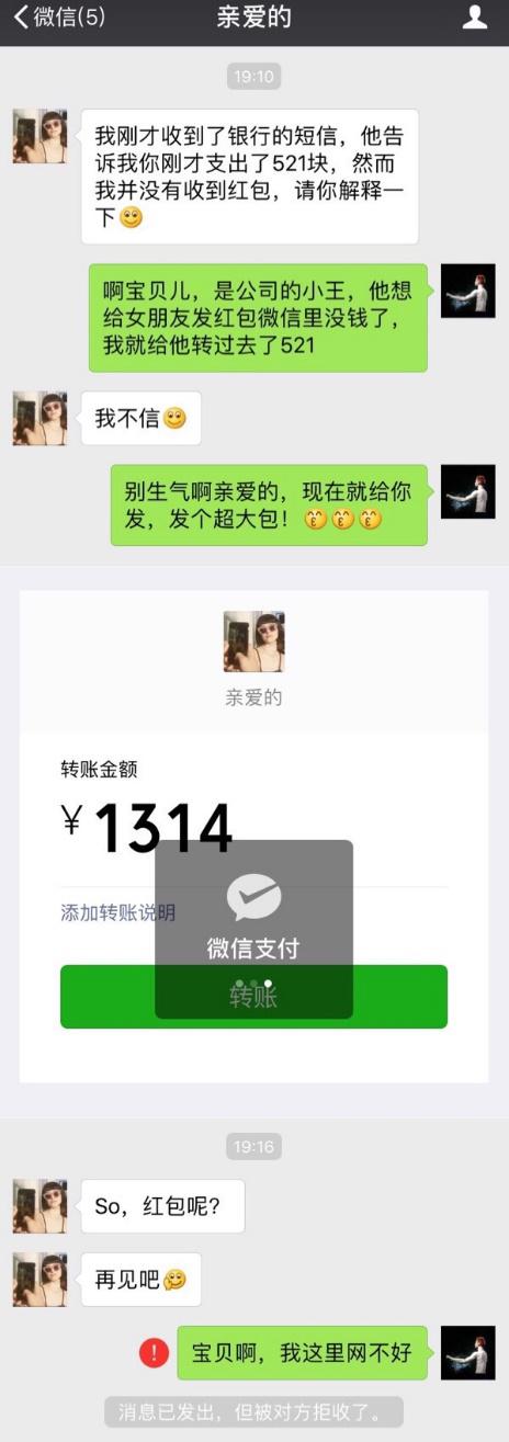 到了中午一定要记得给她发红包,毕竟几百种色号的口红、各种款式的包包DiorChanelGivenchy的香水……像你这种直男审美是不会懂的。在发红包之前一定要先找到一个网络信号满格的地方,不然出现这样的情况她会生气的: