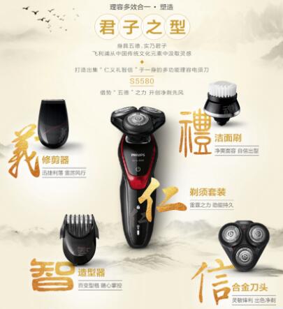飞利浦五德须刀充满中国风的设计包装细节彰显品味与内涵,体现现代男性內承君子之风,搭配飞利浦5000系列剃须刀及多款不同功能替换部件,可完美满足男士的多种理容需求,为现代君子带来富有内涵所在的优质理容体验。中华君子美德结合现代剃须科技,为现代君子带来清爽干净的舒心体验的同时,传承传统君子美德,由心及表,成为“仁义礼智信”的现代君子。值此中秋佳节,“五德”中国风限量礼盒,既具实用价值,又表达了美好的情谊,是君子之礼的完致尚之选,