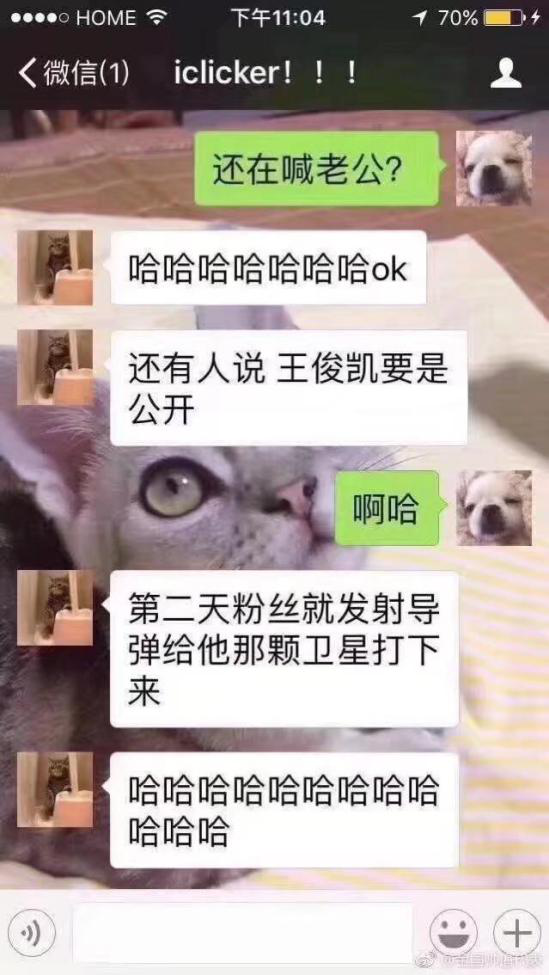 而其他男神的粉丝们也感受到了危急,王俊凯的粉丝就戏称:如果他公布恋情,女主角不是自己,那她就用导弹轰下王俊凯的卫星……
