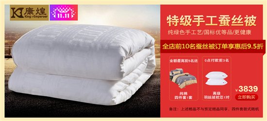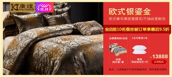 康煌蚕丝被定位高端懂生活的人群,康煌深懂很多朋友已经关注康煌很久了,也知道很多朋友已经将我们的月光水岸加购物车两年了。为了感谢关注康煌很久的朋友,康煌双11特别推出力度特别大的优惠活动。具体如下: