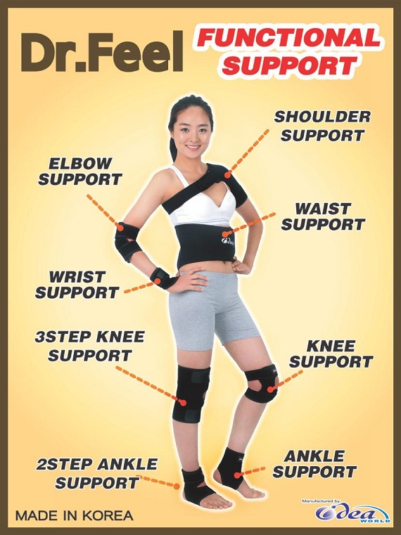 “Idea World”的全身护具以特殊制作的保护弹力材质来保护手腕、肩膀、胳膊肘、腹部、膝盖和脚裸等全身关节。这一系列名为“Dr.Feel”, 广泛用于患者的康复和运动选手的训练等。它适用于保护在日常生活中容易受伤的关节,具有格外舒适的穿着感和卓越的透气效果。
