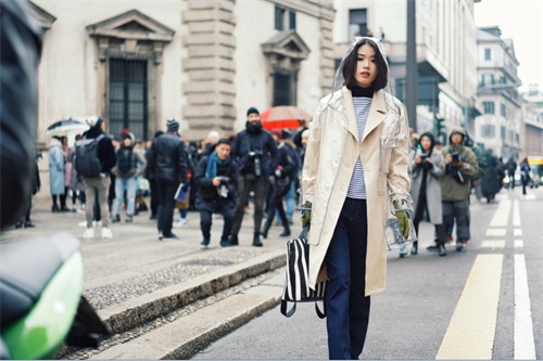 透明外套是这两年潮人们的大爱,军绿色手套与黑白条纹包包、深蓝色裤子撞色,温暖又吸睛。
