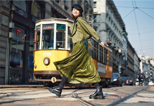 军绿色帅气上衣,搭配丝绒裙,与夸张的红色耳饰、黄色公车的撞色,带出轻复古时尚力。