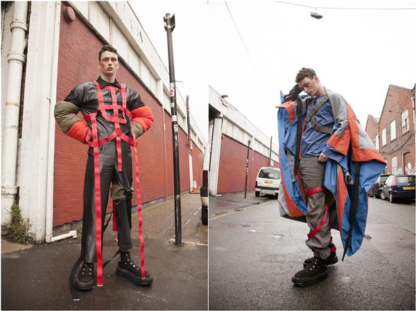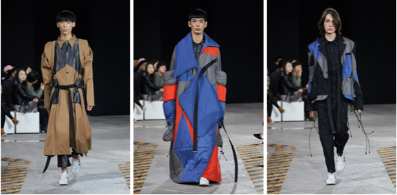 该系列服装同时具有多样性与实穿性。这一季的服装在不缺少设计感的前提下,注重市场需求,选择了更能体现出流浪者的旧布拼接,并将帐篷、睡袋的部分元素运用到设计中。而在面料的选择上,大部分选择了具有功能性的运动面料,让服装更符合实际穿着场景。而面料的颜色选择了暗色加上少许亮色,形成对比。
