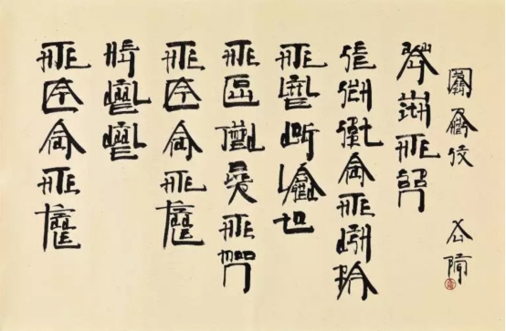他的经典作品——“新英文书法“,更是曾以天价拍出。这些看上去像是汉字的字,每一个构成都是英文字母,一个字就是一个单词。以阅读中文的方式,从左到右,从上到下,从外到里阅读,才可得到每一个字背后的含义。