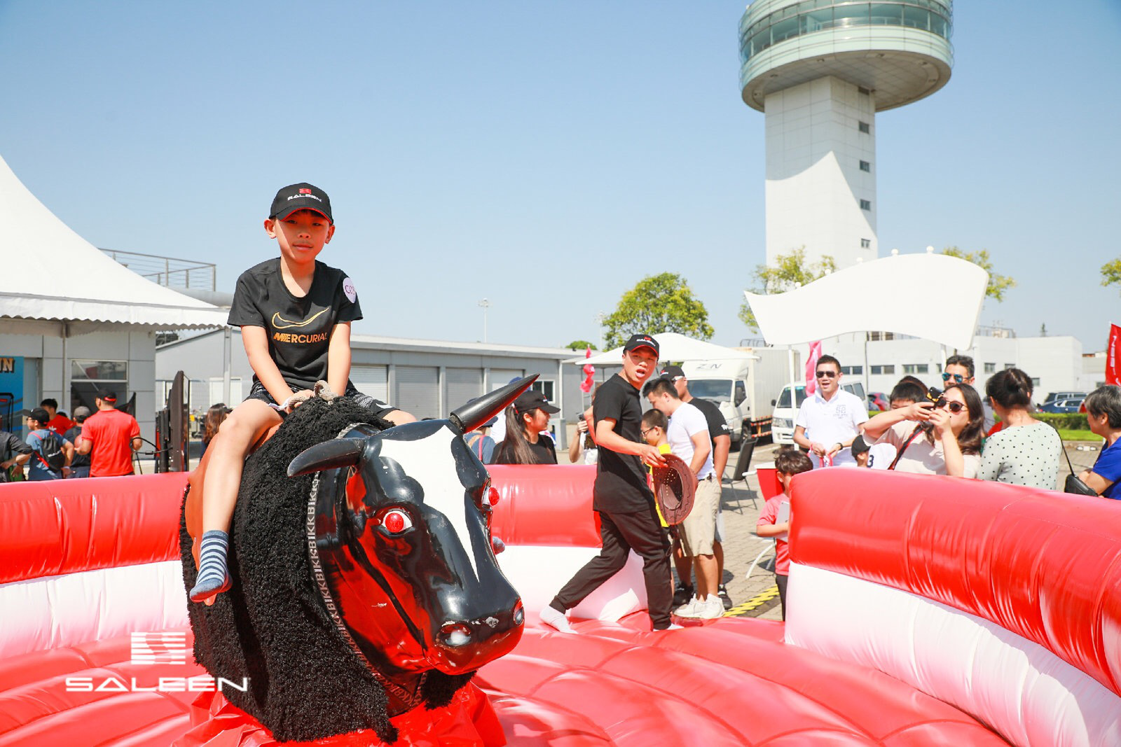 现场还有不少趣味十足的美式游戏,耐力骑牛、美式橄榄球、大力锤等,堪称精华版的美式嘉年华。这些游戏不仅给孩子们带来了乐趣,同时还有很好的热身效果,耐力骑牛锻炼耐力、大力锤训练力量,美式橄榄球考验灵活度,都是卡丁车比赛中不可或缺的获胜秘诀。