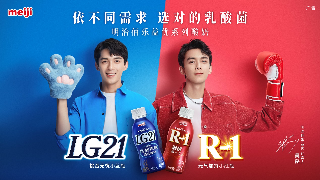 在全新明治佰乐益优系列酸奶广告中,代言人吴磊化身挑战无忧的LG21“乳酸君”和助力元气的R-1“乳酸君”,观察现代人的生活习惯,并基于不同情况下的自身所需,提供不同的选择建议。正如片中明治佰乐益优代言人吴磊所言,明治佰乐益优系列酸奶,依不同需求,选对的乳酸菌。