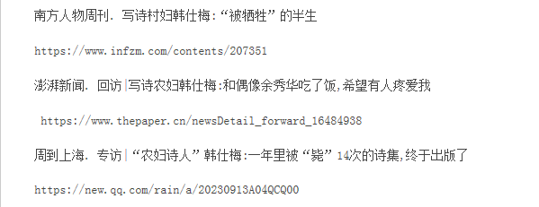 2020年4月,在儿子的提议下,韩仕梅开始将自己写的诗歌发在网上。仅有小学文凭的她,写五言、七言诗,也写现代诗,配张简单的图片,当做视频一样发表了出来。