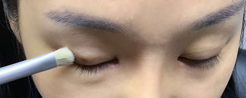 打底之后,再使用自己需要的深色眼影,在眼睫毛和双眼皮褶皱之间的地方用小号一些的眼影刷涂,然后在眼尾的地方稍微晕染的面积大一点,上色之后,再使用大一号的眼影刷把这层眼影晕染开,让眼影有一个层次感,晕染出渐变的感觉。