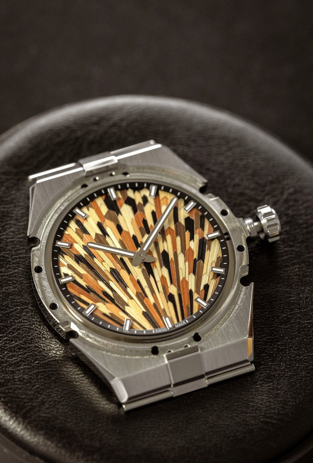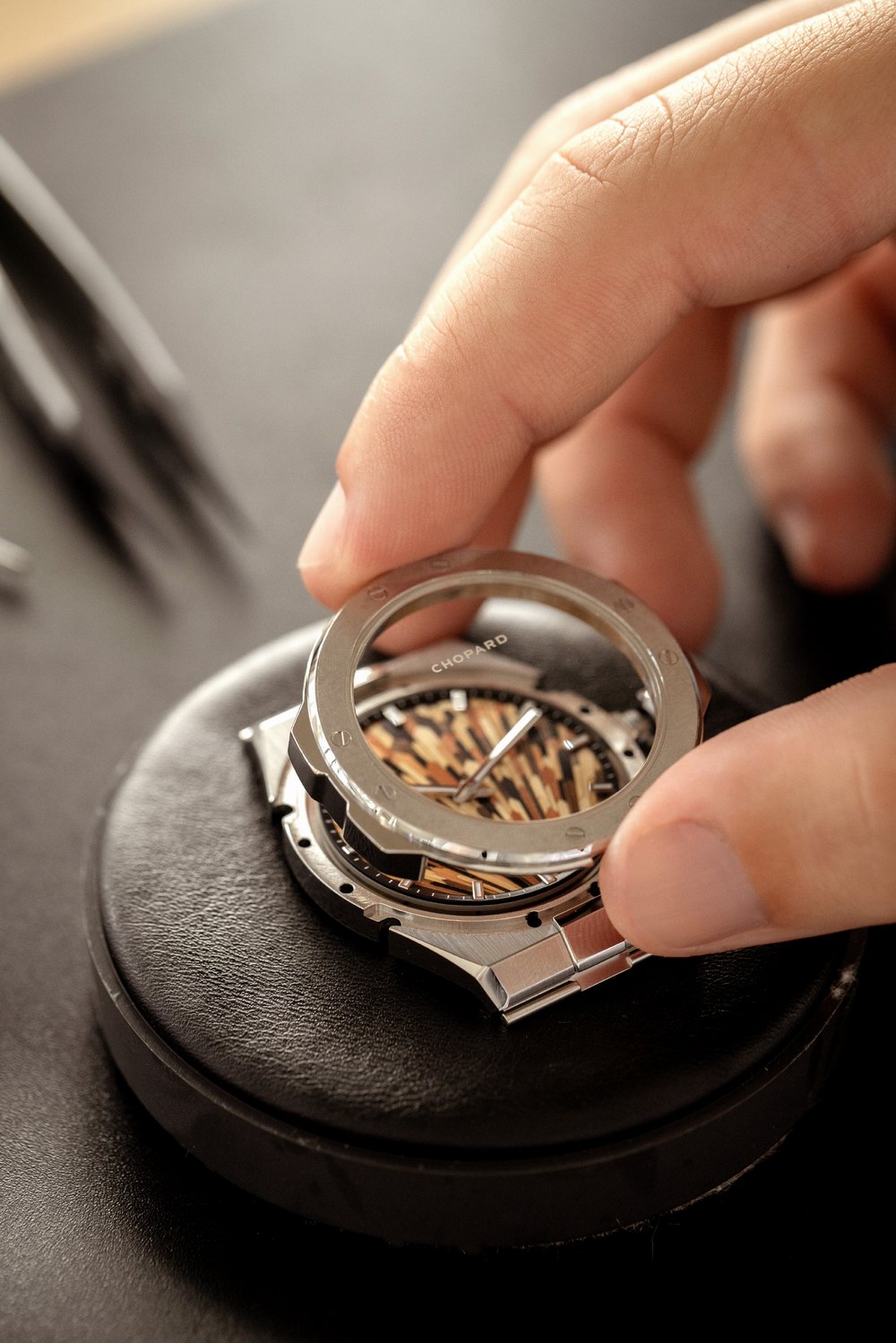 萧邦雪山傲翼系列41 XP腕表,表盘采用麦秆细工镶嵌工艺